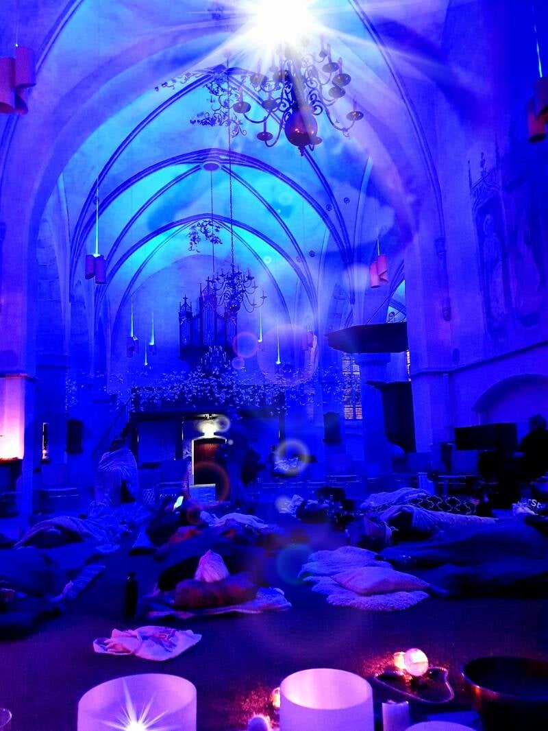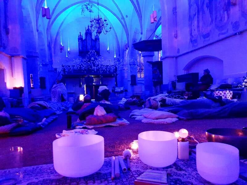 Neem een dik matras, een deken en een kussen mee en kleed jezelf comfortabel en warm aan om lekker te baden in kosmisch geluid...